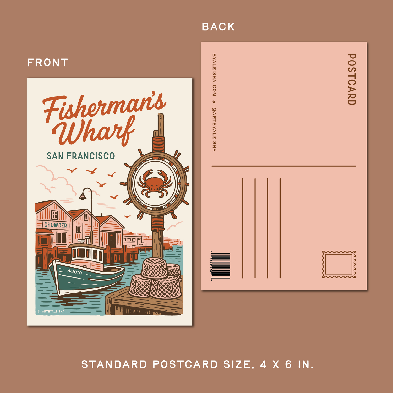 4"x6" postcard featuring Aleisha's illustrated design of San Francisco's infamous Fisherman's Wharf! Say "I wish you were here" in style!