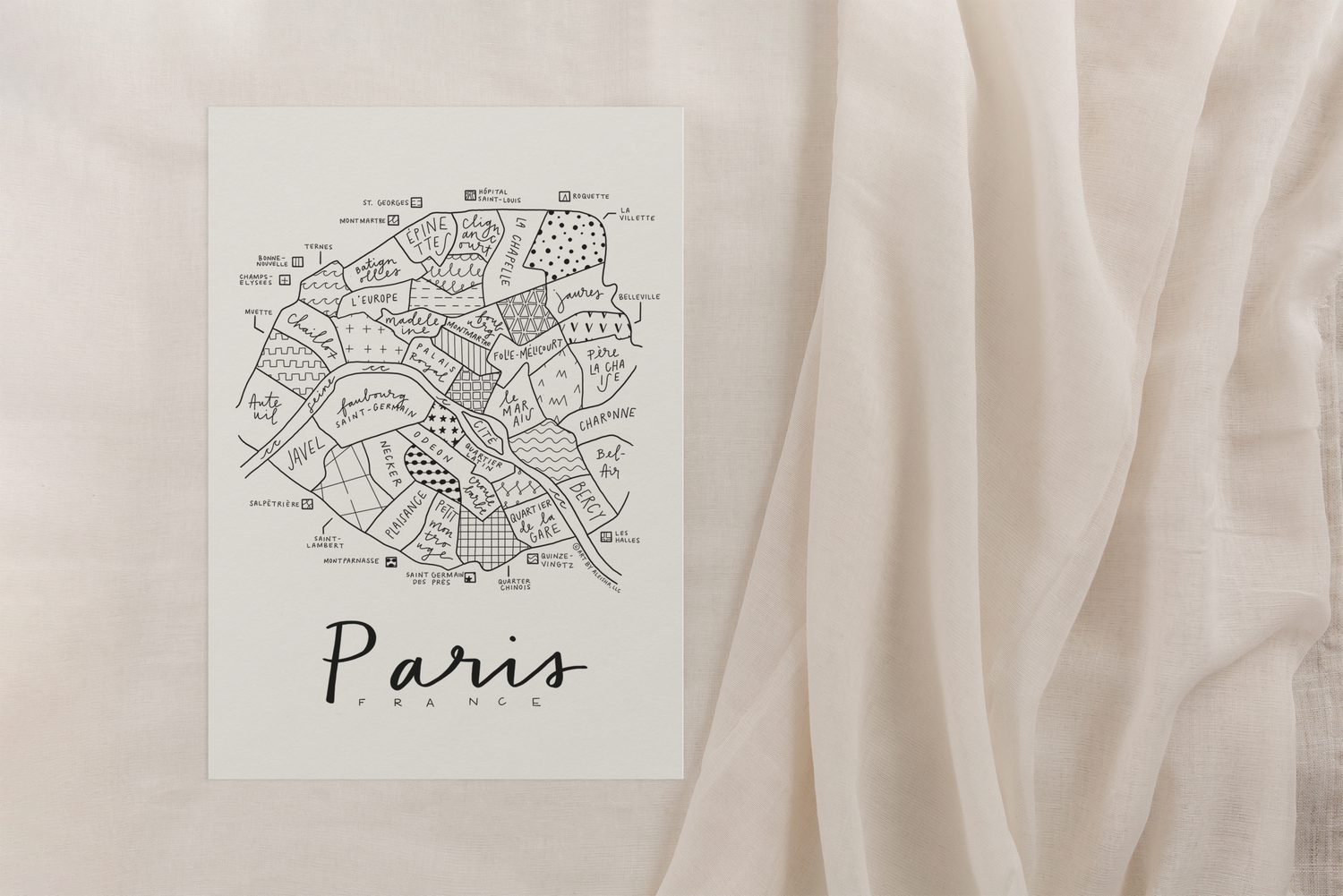 Black and white print of Aleisha’s originally hand-illustrated neighborhood map design of Paris, France.