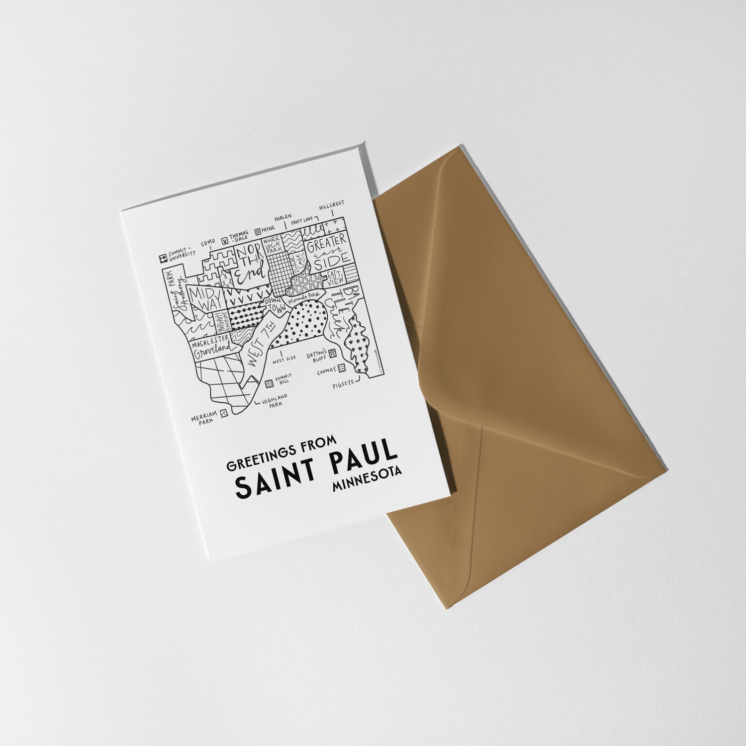 4"x5.5" folded greeting card featuring Aleisha's originally hand-illustrated neighborhood map design of Saint Paul, Minnesota. Card is blank inside.