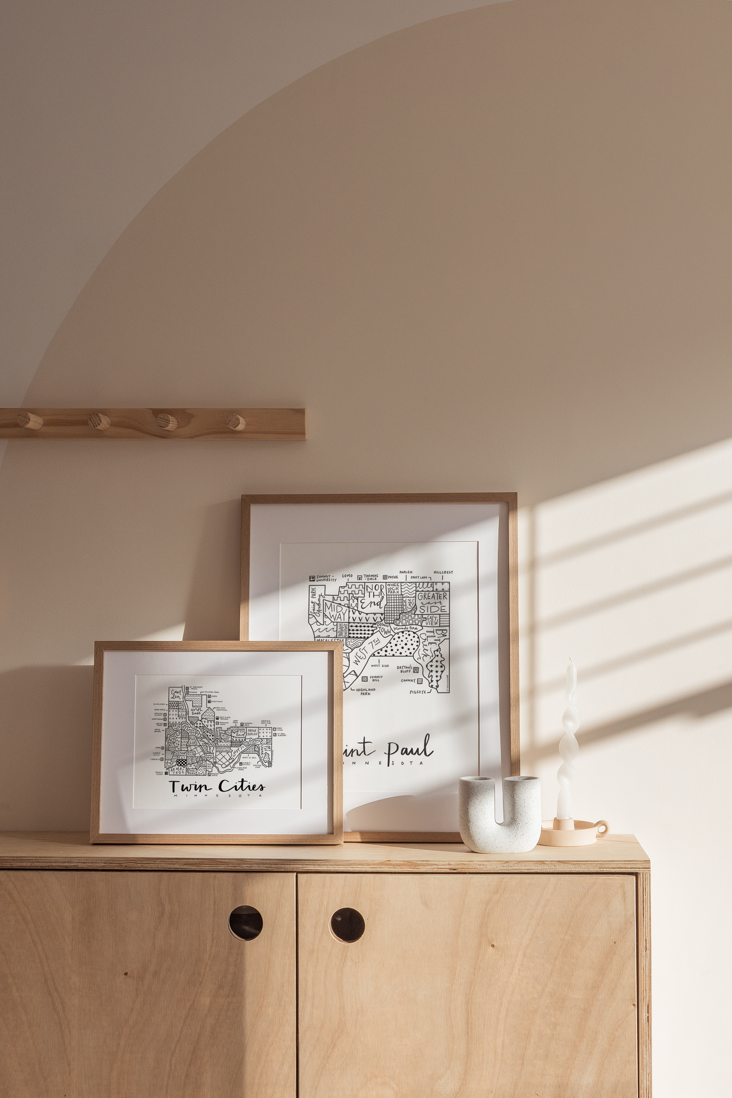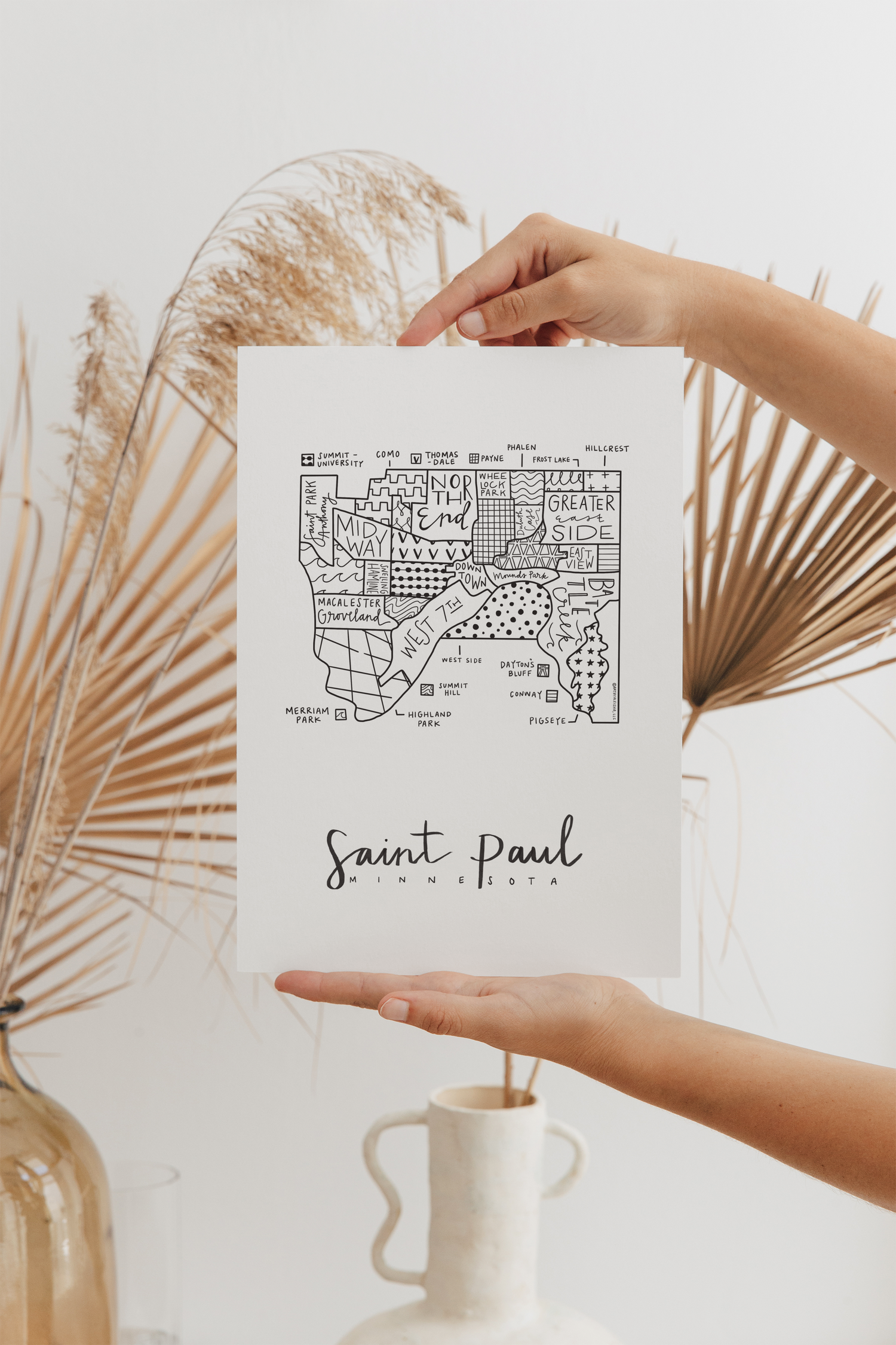 Black and white print of Aleisha’s originally hand-illustrated neighborhood map design of Saint Paul, Minnesota.