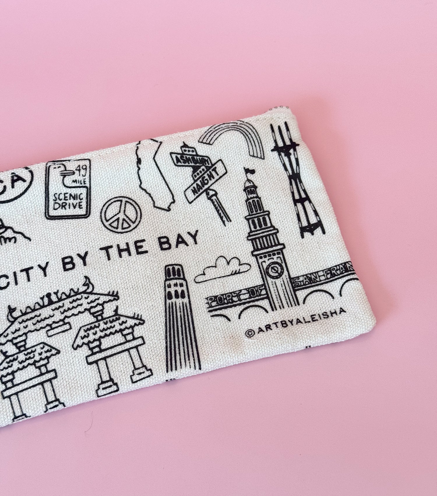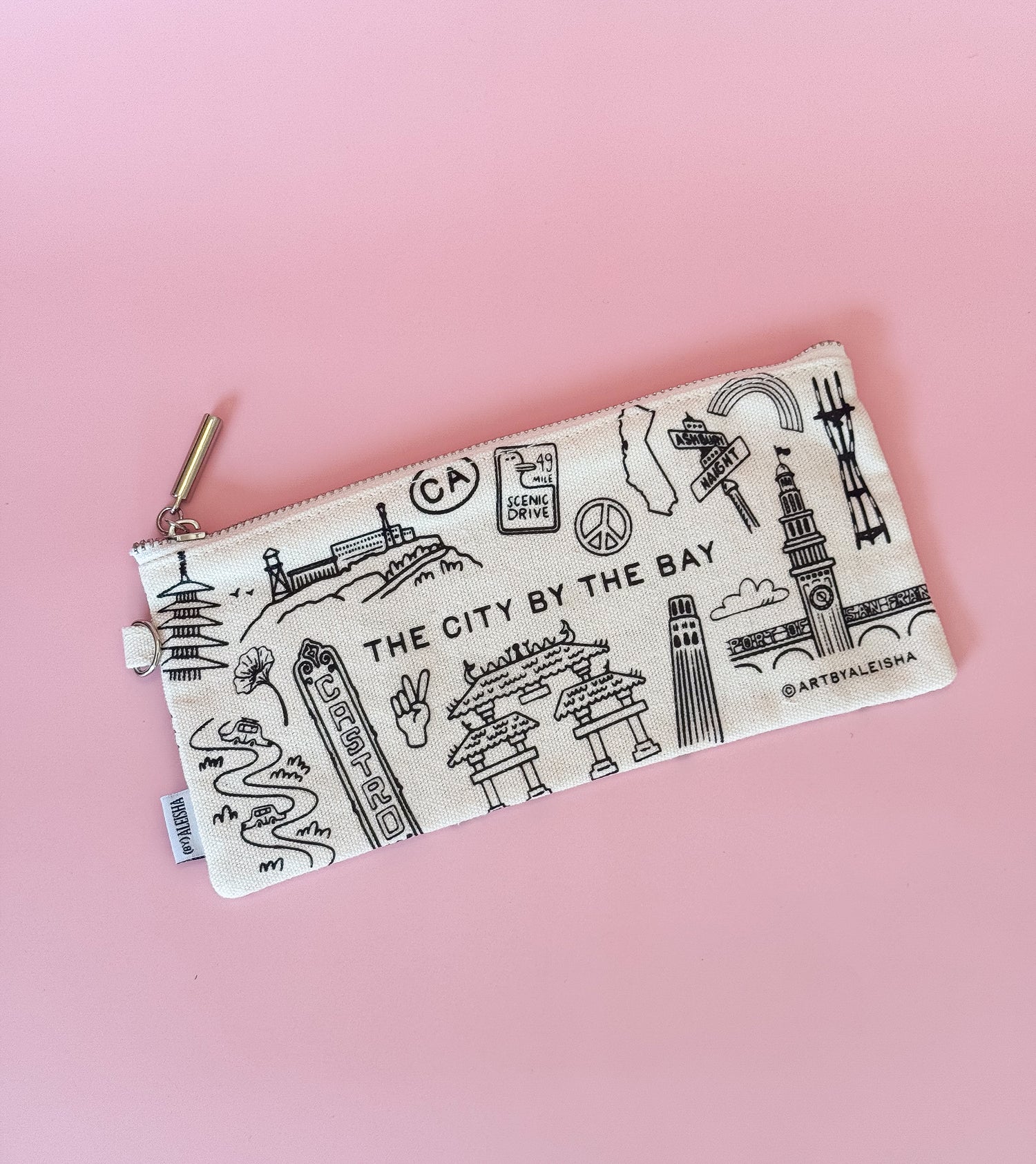 Organize in style with our durable 9"x4" canvas pencil pouch featuring Aleisha’s hand-illustrated design of San Francisco’s most beloved icons — from the Golden Gate Bridge to the cable cars and Painted Ladies. The design is screen-printed for a bold, lasting finish. The long-lasting metal zipper keeps everything secure whether you’re on the go or at your desk. A practical keepsake with a creative twist — perfect for locals, travelers, and dreamers who left their heart in San Francisco.