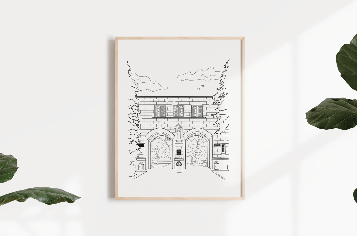 Black and White print of Aleisha’s original hand-illustrated design of the symbolic Arches at the University of St. Thomas in St. Paul, Minnesota.
